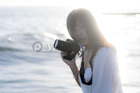 海辺でカメラを構える女性 商用利用可能な写真素材 イラスト素材ならストックフォトの定額制ペイレスイメージズ